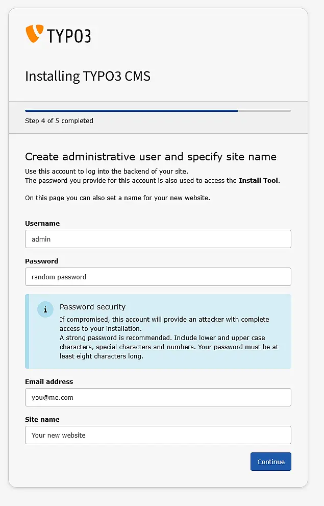 Jetzt können Sie den ersten Backend-Benutzer anlegen. Das ist dann der Administrator des Systems. Zur Vergabe eines sicheren Passworts benutze ich gerne die Seite https://www.passwort-generator.com/. In das Feld "Site name" tragen Sie ein, was im Seitenbaum des TYPO3-Systems ganz oben stehen soll (z.B. "Meine neue TYPO3-Seite", oder was immer Ihnen gefällt.)