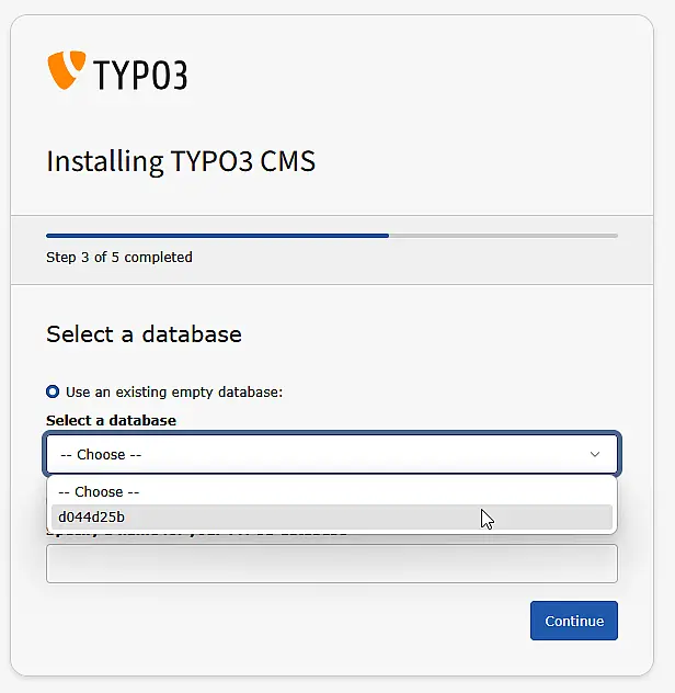 Nachdem Sie die Daten eingetragen haben, müssen Sie die Datenbank angeben in die dann die Standard-Tabellen von TYPO3 angelegt werden.